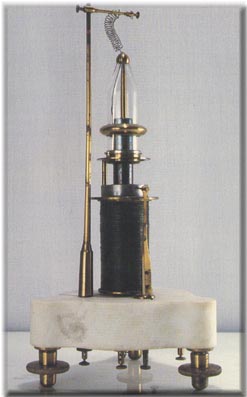 Dal bordo di platino della campana risalivano due fili elettrici che, mediante una spirale metallica ed una colonna a squadra, la collegavano all'altro polo della pila. Il circuito azionava l'apparato indicatore-registratore quando le oscillazioni della campana di vetro facevano urtare il bordo platinato con uno o più fili, del medesimo metallo, posti tra essa ed il sostegno astile.