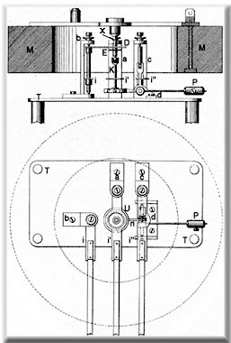Sulla massa M era fissata una traversa nel cui centro era fissato un perno di acciaio (X) che terminava inferiormente a forma di sferetta. Sotto alla massa si trovava un tavolino (T) per l'alloggiamento di una serie di piccole leve che in seguito ad un movimento del basamento (scossa sismica) andavano ad urtare il perno X nel centro di gravità della massa. Il sistema di leve mettendosi in movimento rispetto alla resistenza inerziale del perno producevano movimenti trasmessi al sistema di registrazione che era così composto: sul tavolino erano avvitate tre staffe (a, b, c) nelle quali erano imperniati degli assetti verticali d'acciaio. I due assetti sulle staffe a e b (le quali erano tra loro perpendicolari) portavano alla sommità ognuna una piccola lastra di ottone (E e D) sulla quale era praticata un'asola. All'interno delle asole passava il perno di acciaio (X). Alla parte inferiore dei due assetti verticali delle staffe a e b erano fissate due sottili leve (i ed i'); la prima ad angolo retto rispetto alla leva ad asola D e la seconda parallela alla sua leva ad asola E. Le leve i ed i' erano prolungate mediante due striscette di legno che portavano alla estremità due aghi verticali registrabili in altezza. Questi due elementi erano destinati alla scrittura delle componenti orizzontali sulla carta affumicata. L'ingrandimento fornito dalla lunghezza delle strisce di legno era di 10 volte.