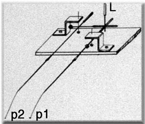 Il disegno illustra il particolare del sistema di scrittura con le leve p1 e p2.