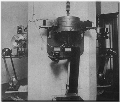 La piastra circolare alla base della massa era provvista di un foro nel quale era alloggiato l'estremo superiore della leva amplificatrice. La leva amplificatrice (L) era formata da un piccolo tubo di alluminio saldato ad un anello di alluminio e da un ago di acciaio; un secondo ago era saldato nella parte inferiore del tubo di alluminio. Il tubo costituiva il braccio lungo della leva mentre l'ago d'acciaio quello corto. La punta dell'ago di acciaio, un po' più alta nel centro dell'anello, andava a poggiare su un cappellotto di vetro fissato con il mastice all'estremo del braccio orizzontale del sostegno S. La base del sostegno S era fissata con un bullone (G) ad un'asta di ferro infissa nel muro.