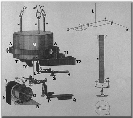 Un anello di ferro AA, sostenuto da due supporti avvitati nella parte posteriore delle travi T1 e T2 circondava la massa; avvitate a questo anello tre grandi viti a testa graduata, disposte simmetricamente intorno alla massa, avevano lo scopo di ridurre le oscillazioni del pendolo e di misurare l'ingrandimento delle leve.
