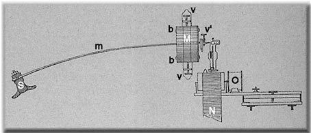Il sistema di amplificazione e di registrazione era costituito da due leve di alluminio: la prima (l) ad angolo aveva la funzione di moltiplicare il movimento verticale della massa e contemporaneamente di trasformarlo in movimento orizzontale; la seconda leva (l'), anch'essa moltiplicatrice andava con la sua parte estrema, sulla quale era montata una striscia di vetro, a registrare sulla carta affumicata.