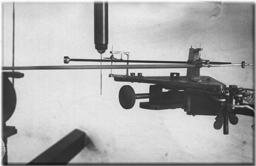 Il raccordo tra il pendolo e la prima delle due leve moltiplicatrici era costituito da un sottile ago sporgente dalla estremità inferiore di uno stelo metallico di un centimetro di diametro, fissato alla base della massa pendolare e posizionato lungo il prolungamento dell'asse del cilindro. La lunghezza dello stelo metallico era tale che l'amplificazione dello spostamento del pendolo era di una volta e mezzo. Sopra il primo ago poggiava un altro ago saldato, con un angolo di 45 gradi, ad un tubo sottile di acciaio del diametro di circa 2 mm. ruotante sul piano orizzontale. L'estremità più grossa del tubo passava attraverso un buco praticato su di un apposito supporto mentre la punta era alloggiata sopra un rubino. Questa leva era equilibrata tramite un piccolo peso di ottone e forniva un ingrandimento di dieci volte. La prima leva era collegata alla seconda leva moltiplicatrice, che era anche quella di scrittura, attraverso un ago. Il braccio lungo di quest'ultima misurava 33-34 cm. mentre quello corto 10 mm.; l'ingrandimento totale raggiunto dallo strumento era di circa 500 volte.