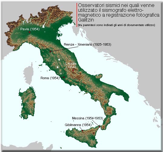 MAPPA DI DISTRIBUZIONE DEL SISMOGRAFO ELETTRO-MAGNETICO A REGISTRAZIONE FOTOGRAFICA GALITZIN TRA IL 1925 E IL 1963